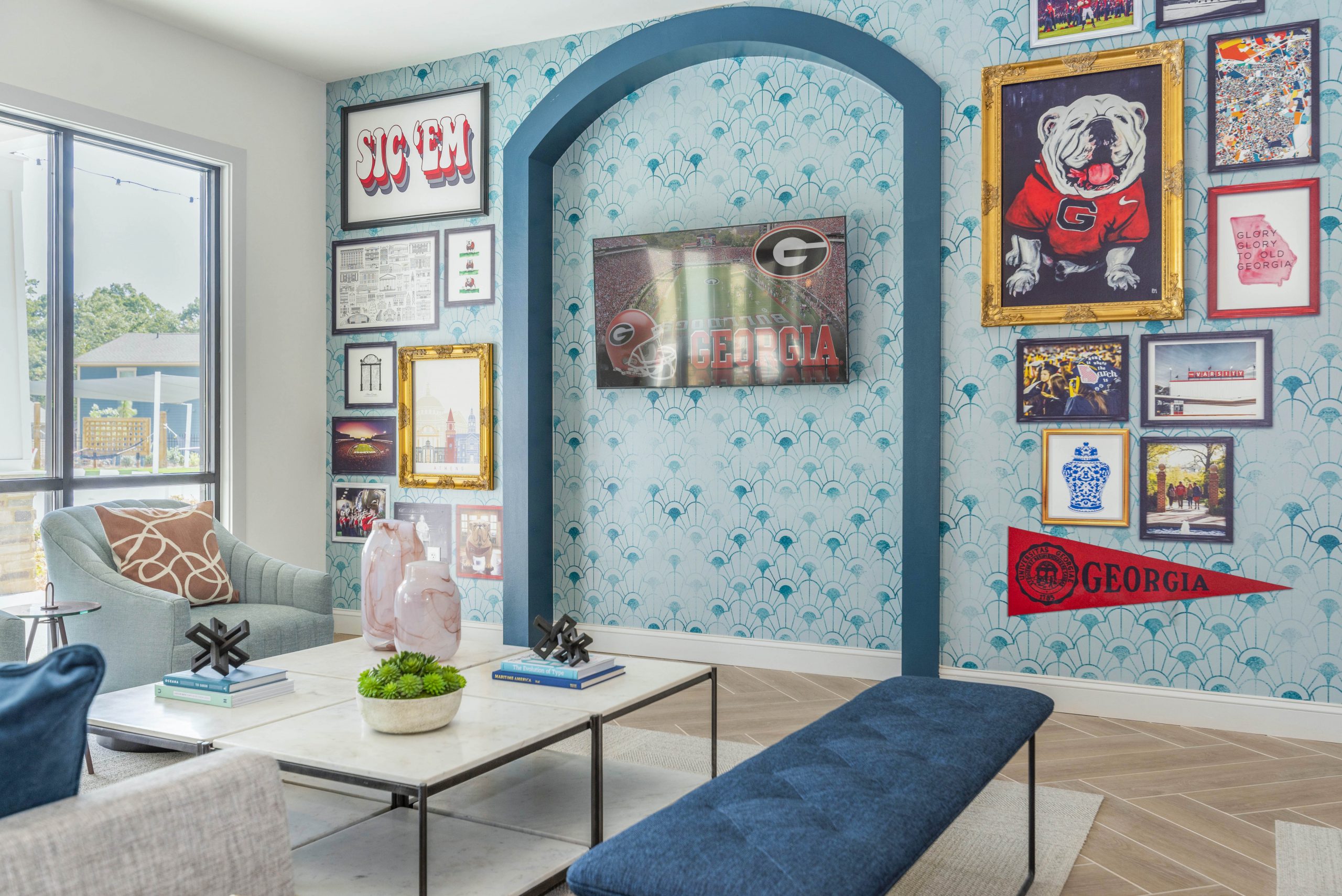 The design team incorporated deep reds, soft blues, and textured neutrals throughout the space. Merging sophistication and playfulness, the client appreciated the subtle incorporation of the University of Georgia’s school spirit and the historic city of Athens without going to the excess. A few noteworthy design elements include the custom-made bulldog sconces, framed vinyl record art display, archways resembling “The Arch” on campus, and UGA-inspired photograph wallcovering with actual 3-D frames applied to create a visually dimensional art installation.