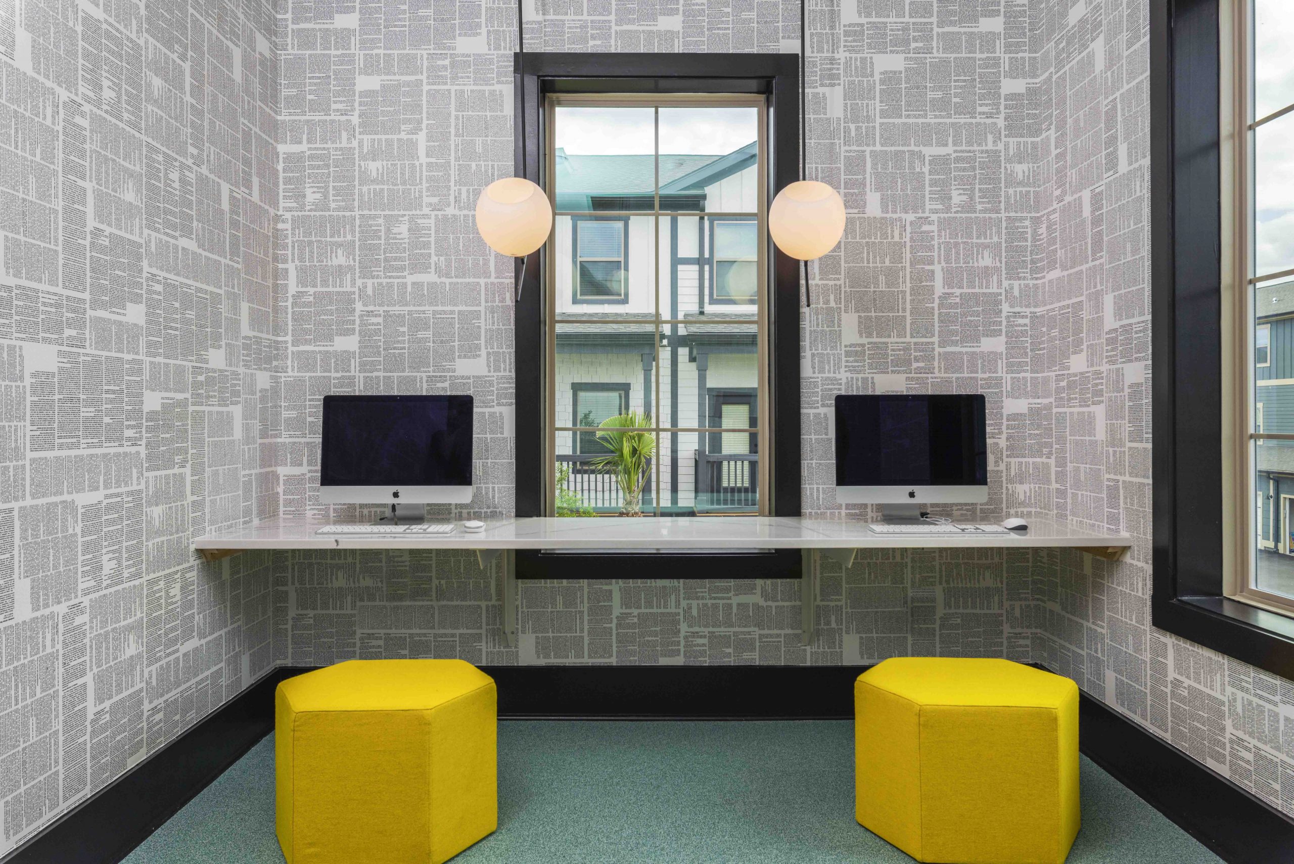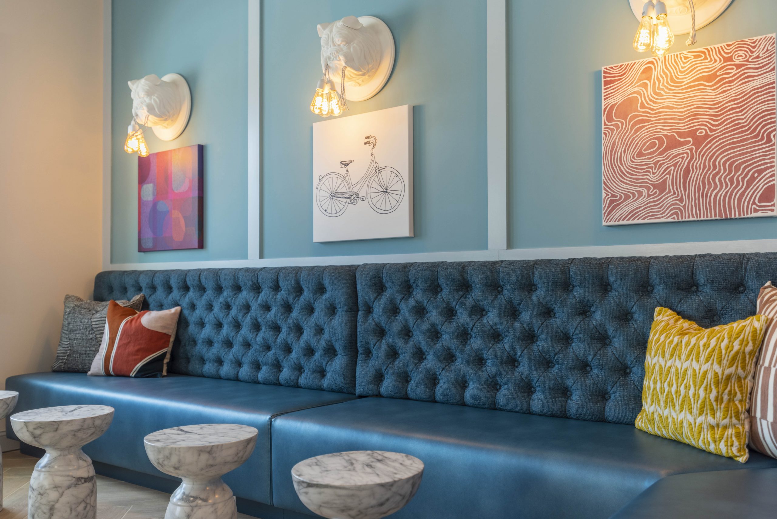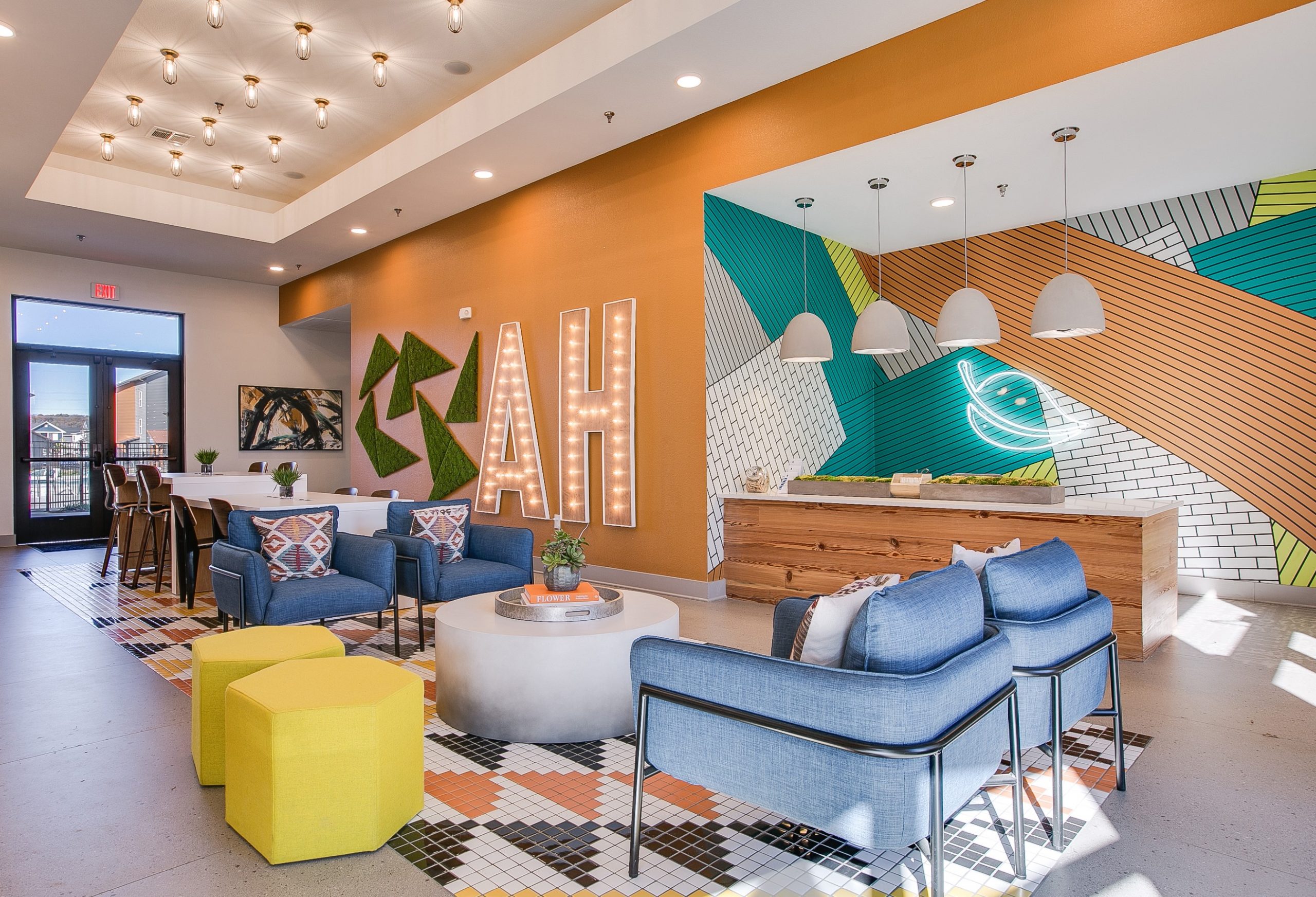 Bold colors combined with geometric patterns were the inspiration for the project. Designers pulled hues of orange from the exteriors of the building to give the property a more cohesive feel. The design team intermixed a bold secondary palette and cheeky graphics to create a whimsical student environment.