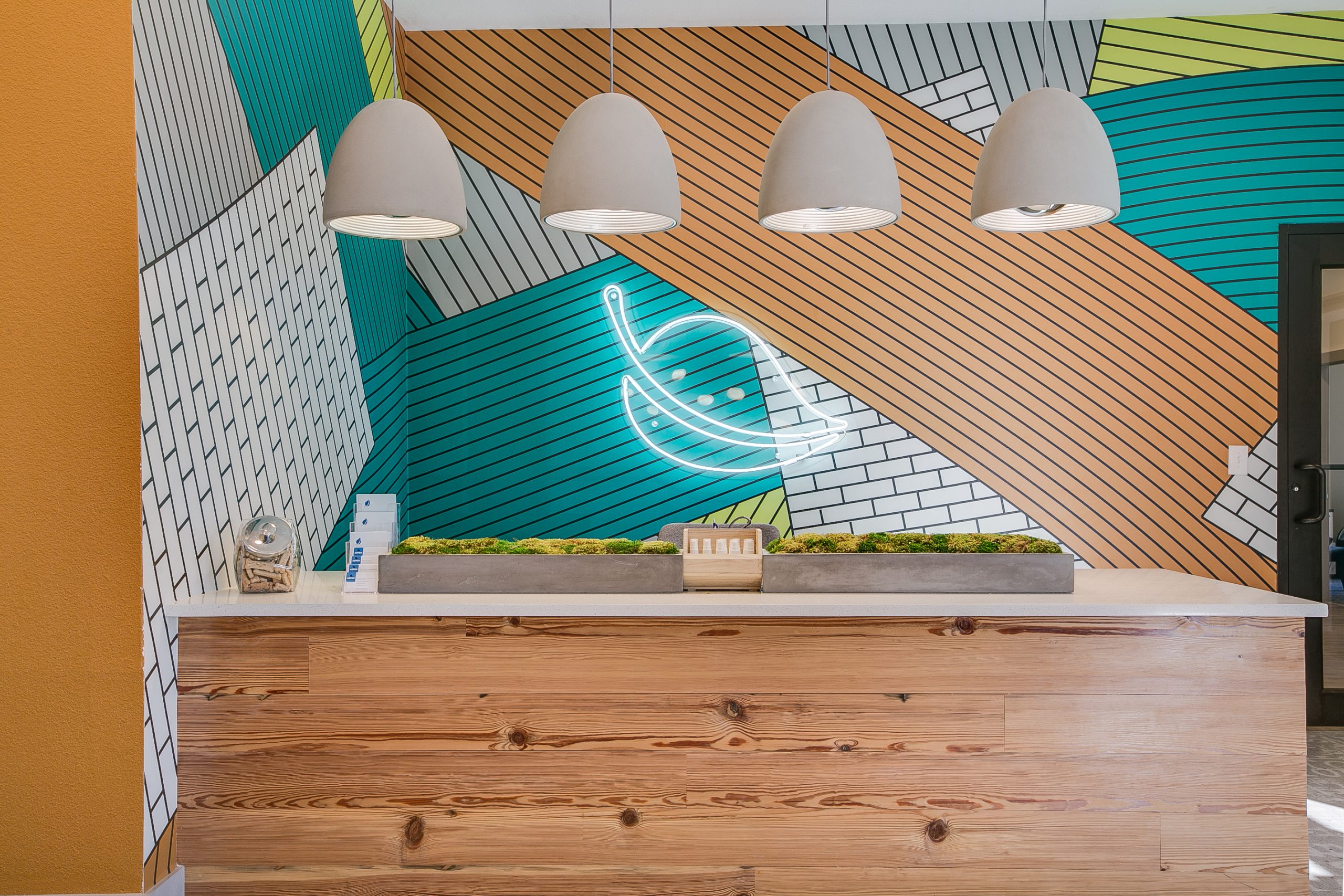 Bold colors combined with geometric patterns were the inspiration for the project. Designers pulled hues of orange from the exteriors of the building to give the property a more cohesive feel. The design team intermixed a bold secondary palette and cheeky graphics to create a whimsical student environment.