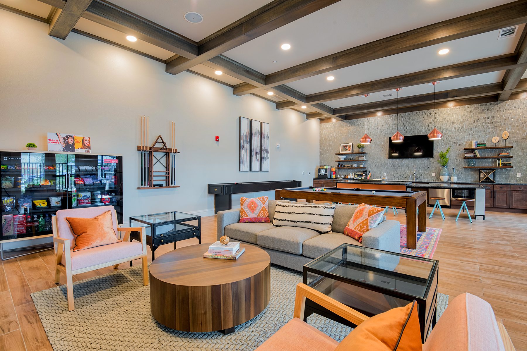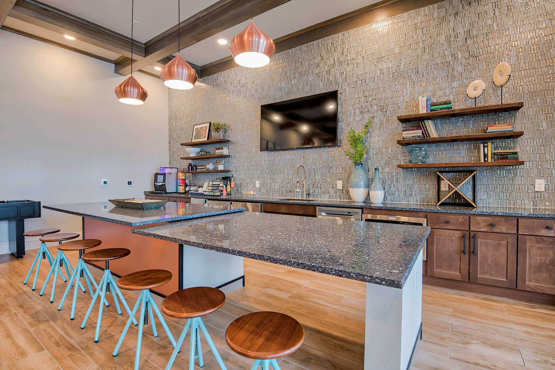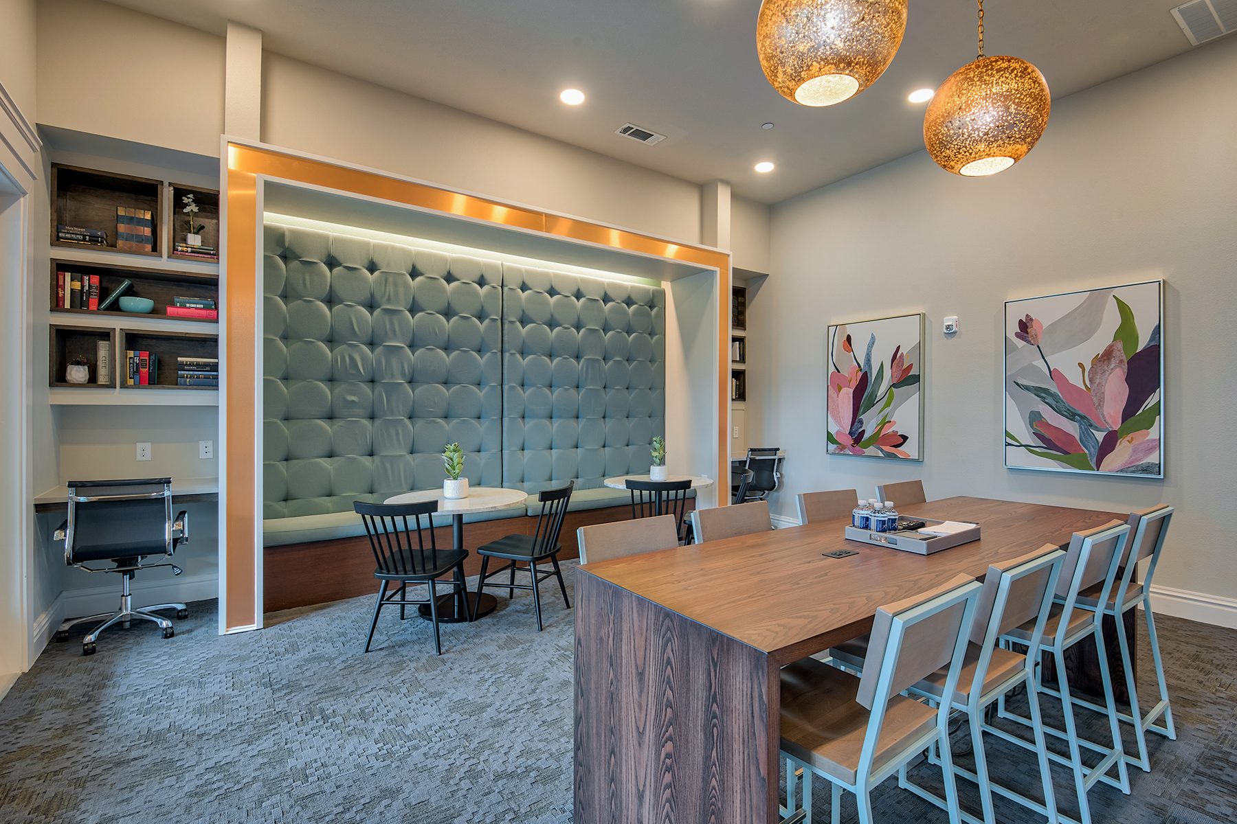 A modern approach to the classic arts and crafts architectural features a mix of copper finishes, detailed moldings, and a contemporary color palette combined to create a comfortable and fresh space for residents. The designer team ensured that the building fit the needs of the local residents as well as the leasing staff. This is reflected in the closing room situated toward the front of the building and gives a glimpse into the communal space while a potential resident waits for an available agent and serves as a small meeting room. This ultimately gives the leasing staff a sense of privacy while keeping a visual on the lobby.