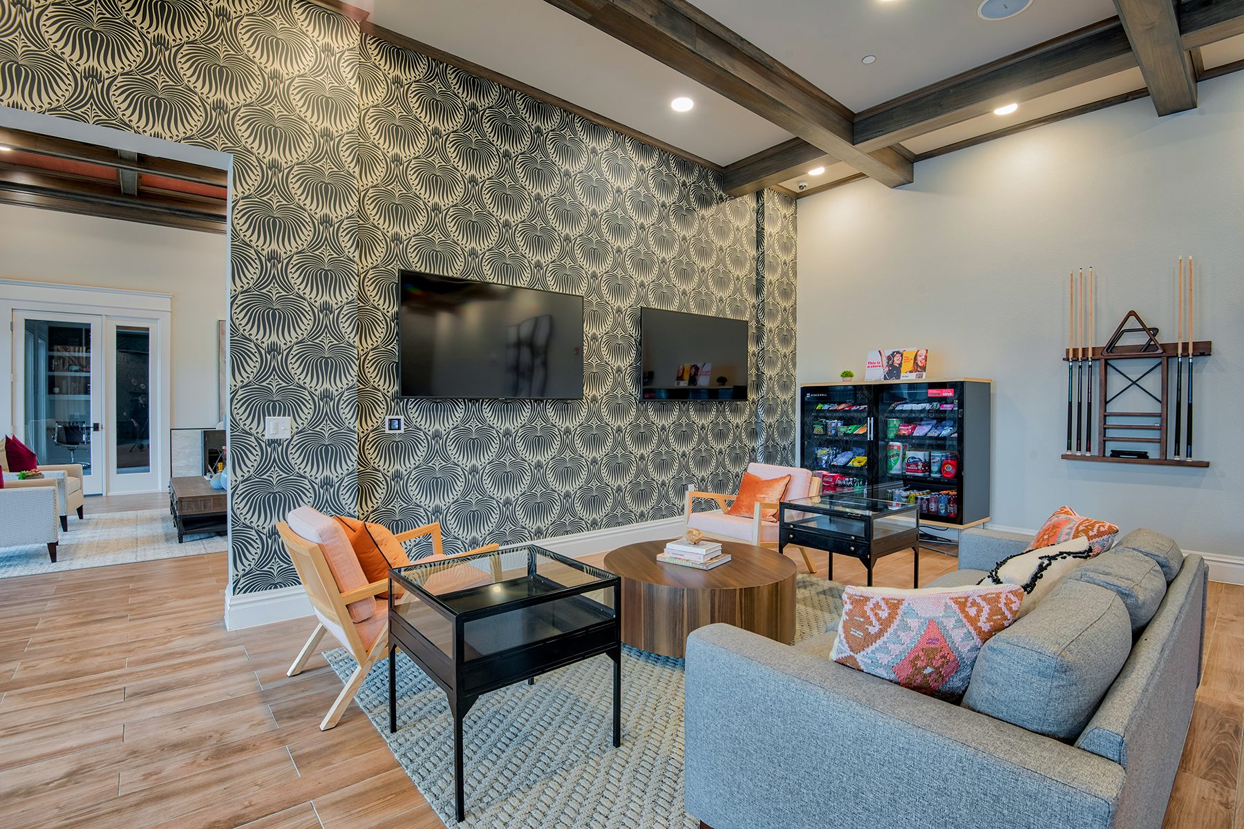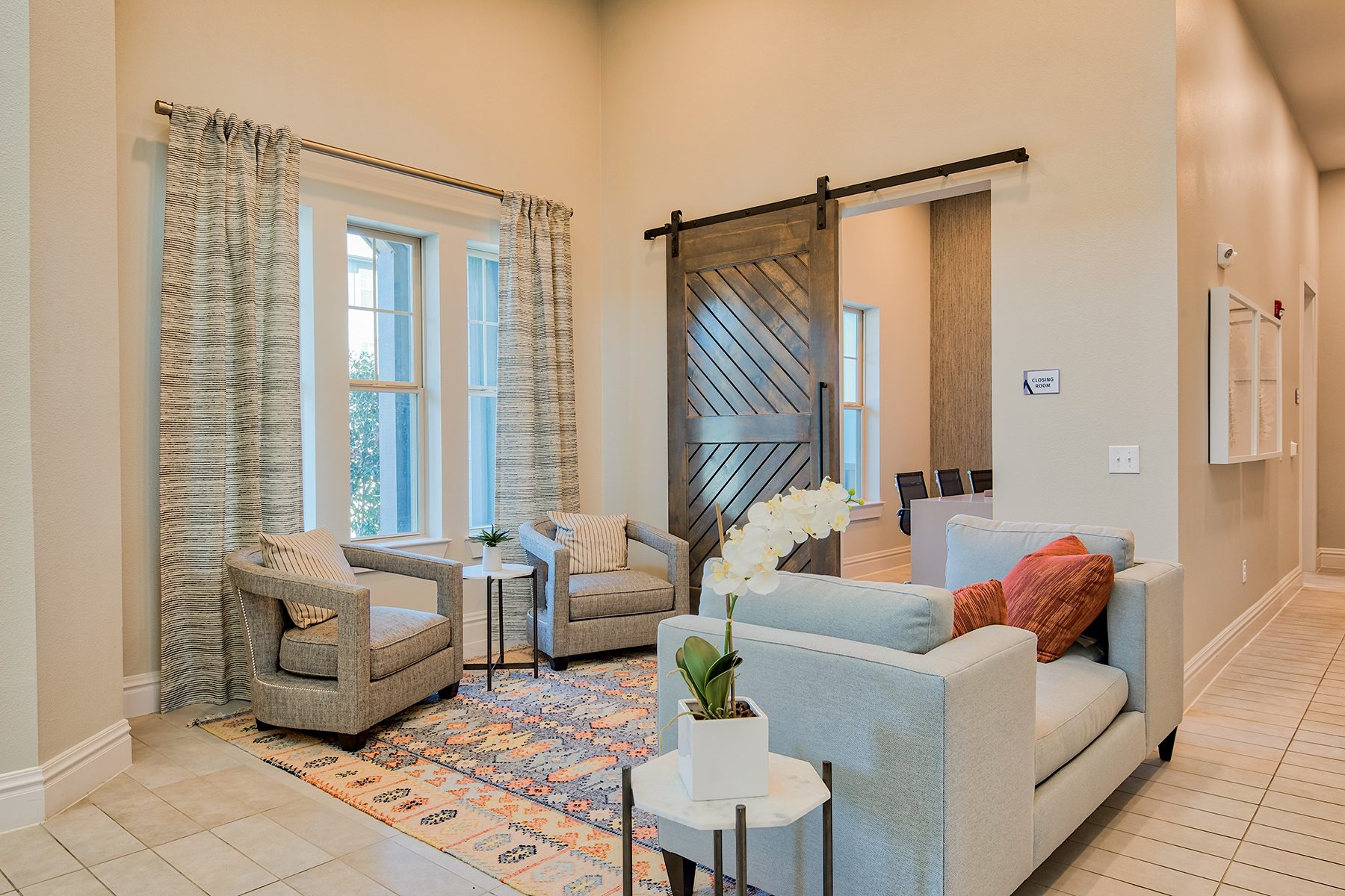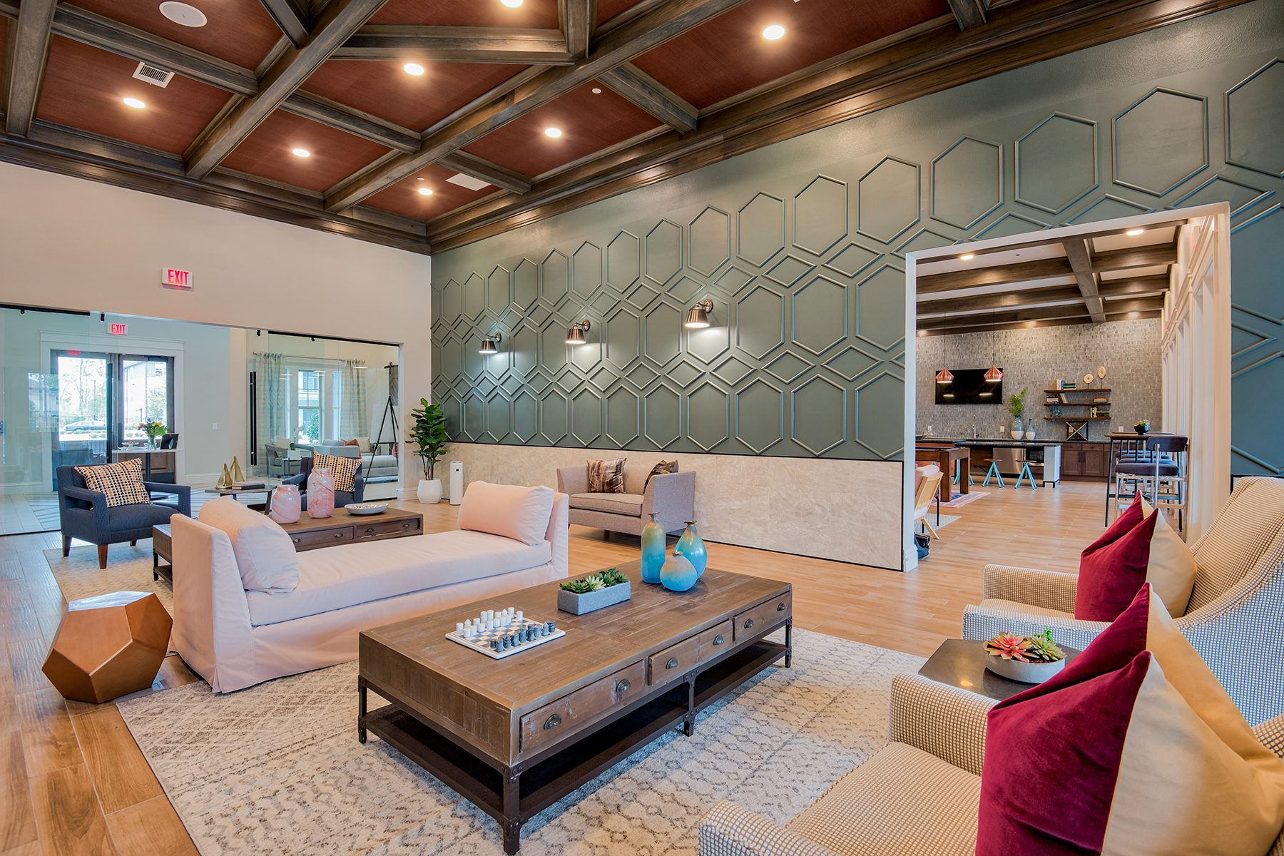 A modern approach to the classic arts and crafts architectural features a mix of copper finishes, detailed moldings, and a contemporary color palette combined to create a comfortable and fresh space for residents. The designer team ensured that the building fit the needs of the local residents as well as the leasing staff. This is reflected in the closing room situated toward the front of the building and gives a glimpse into the communal space while a potential resident waits for an available agent and serves as a small meeting room. This ultimately gives the leasing staff a sense of privacy while keeping a visual on the lobby.