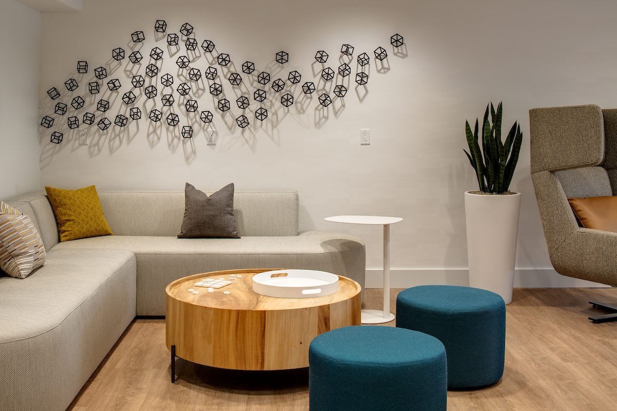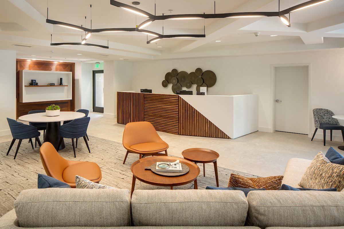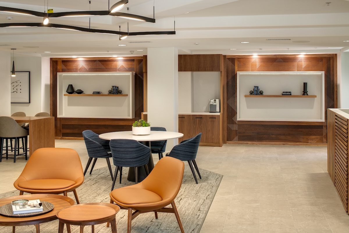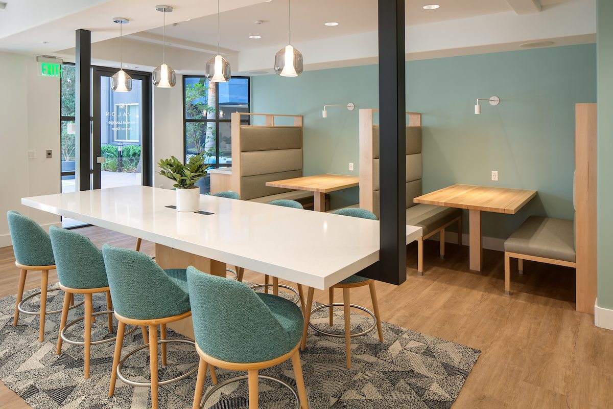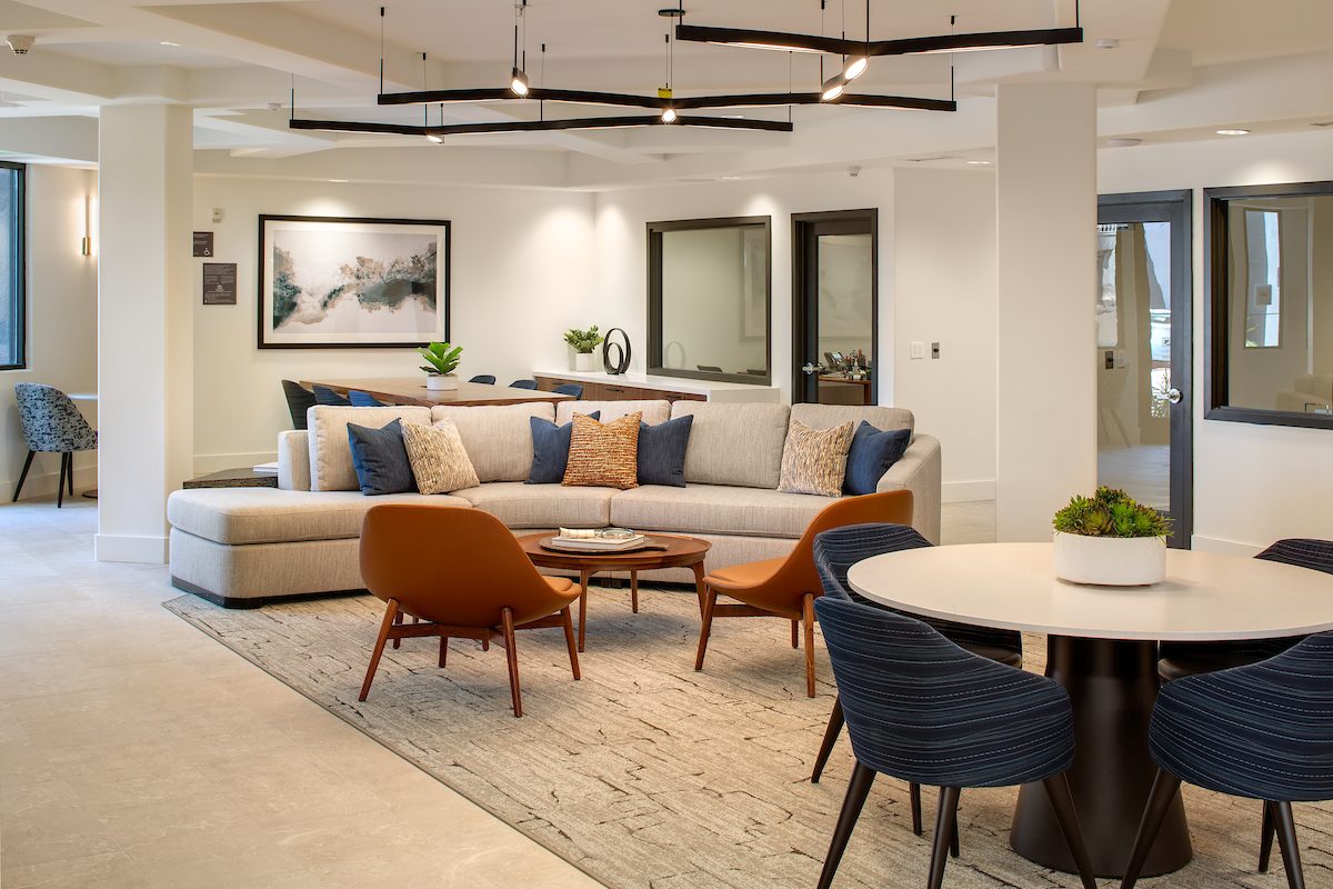 The clubhouse and amenity spaces were upgraded with contemporary interiors with a clean, ethereal color palette consisting of layered whites, warm greys, and strategic placement of deep blues and textured walnut finishes, the design team transformed the leasing office and fitness room into a modern and sophisticated environment. Carrying a similar aesthetic into the lounge space and multi-functional work areas, a more playful palette was incorporated with additions of vibrant teals, built-in seating, and a unique table constructed with steel beams suspended from the ceiling. Focal points include a high-top hospitality bar with a waterfall countertop, a floating custom-built table, and a leasing retreat with natural wood finishes paired with soft seating.