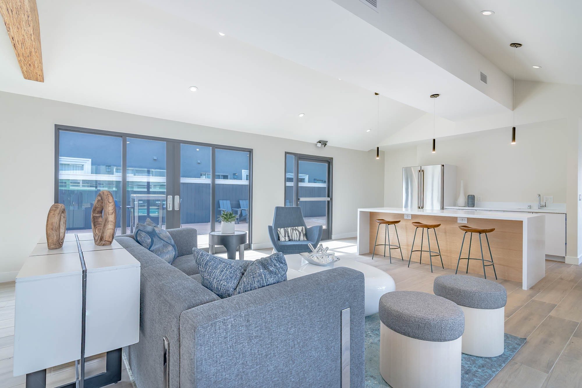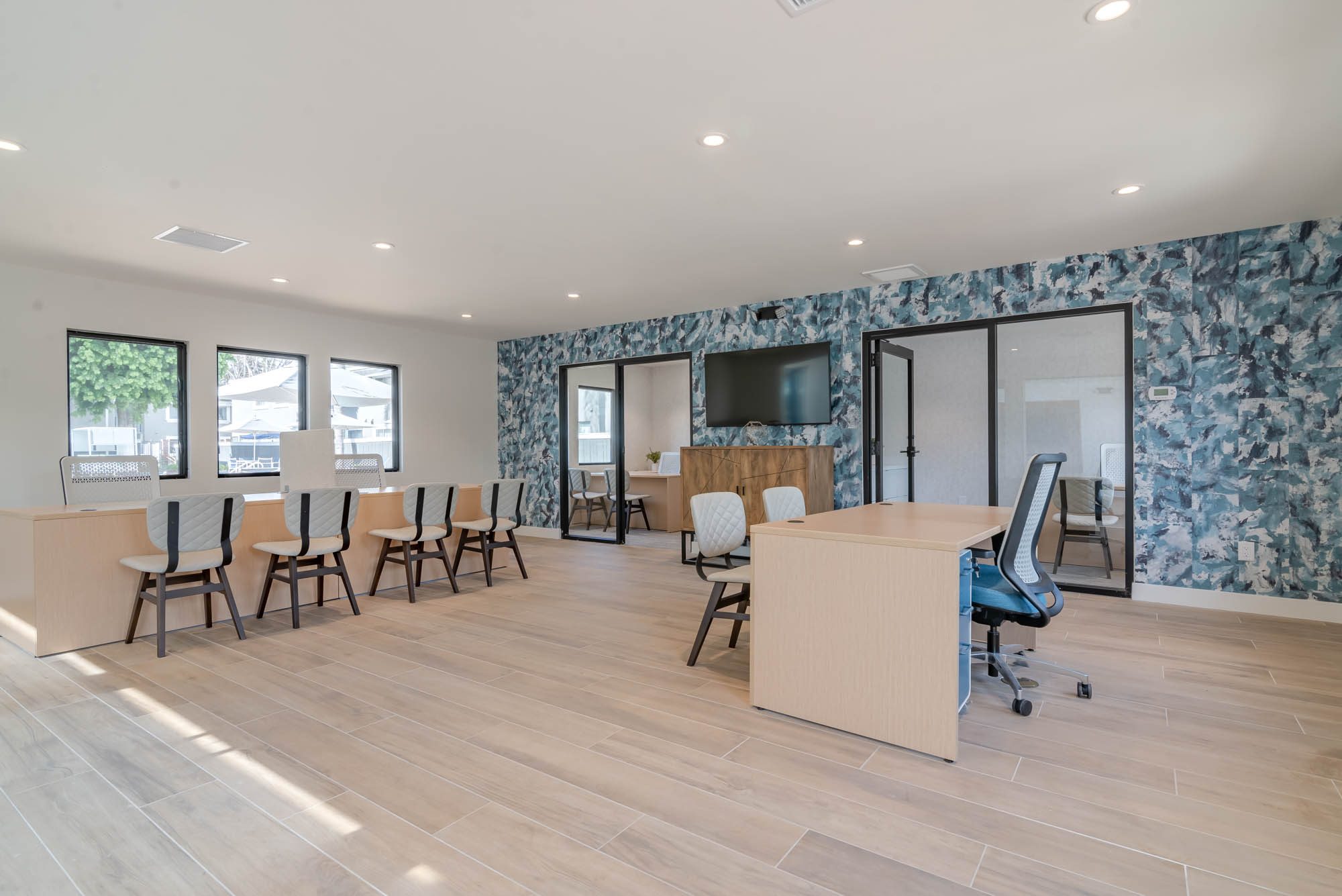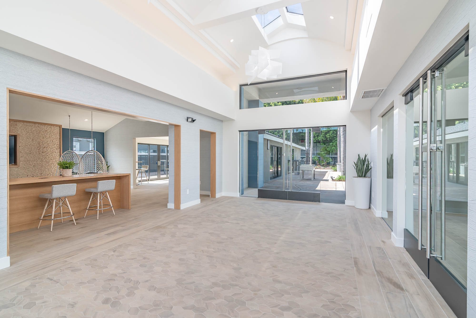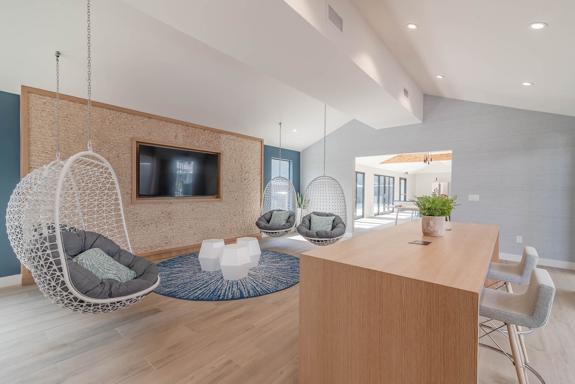 Dual purpose areas were created for both co-working and lounging as well as an entirely second lounge space complete with kitchen, game table and private outdoor retreat.  This project’s coastal location inspired a contemporary finish package that paid homage to the natural elements of the coast with use of light, warm wood tones, and various shades of ocean blue. Shallow millwork provided a focal point and defined the space while providing texture while the hanging chairs added a sense of whimsy and uniqueness.
