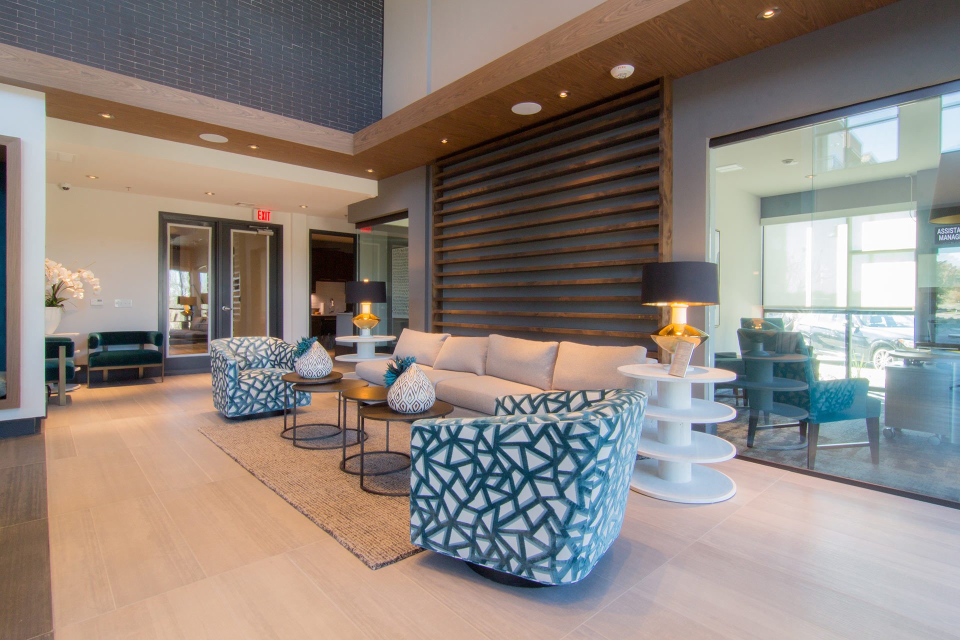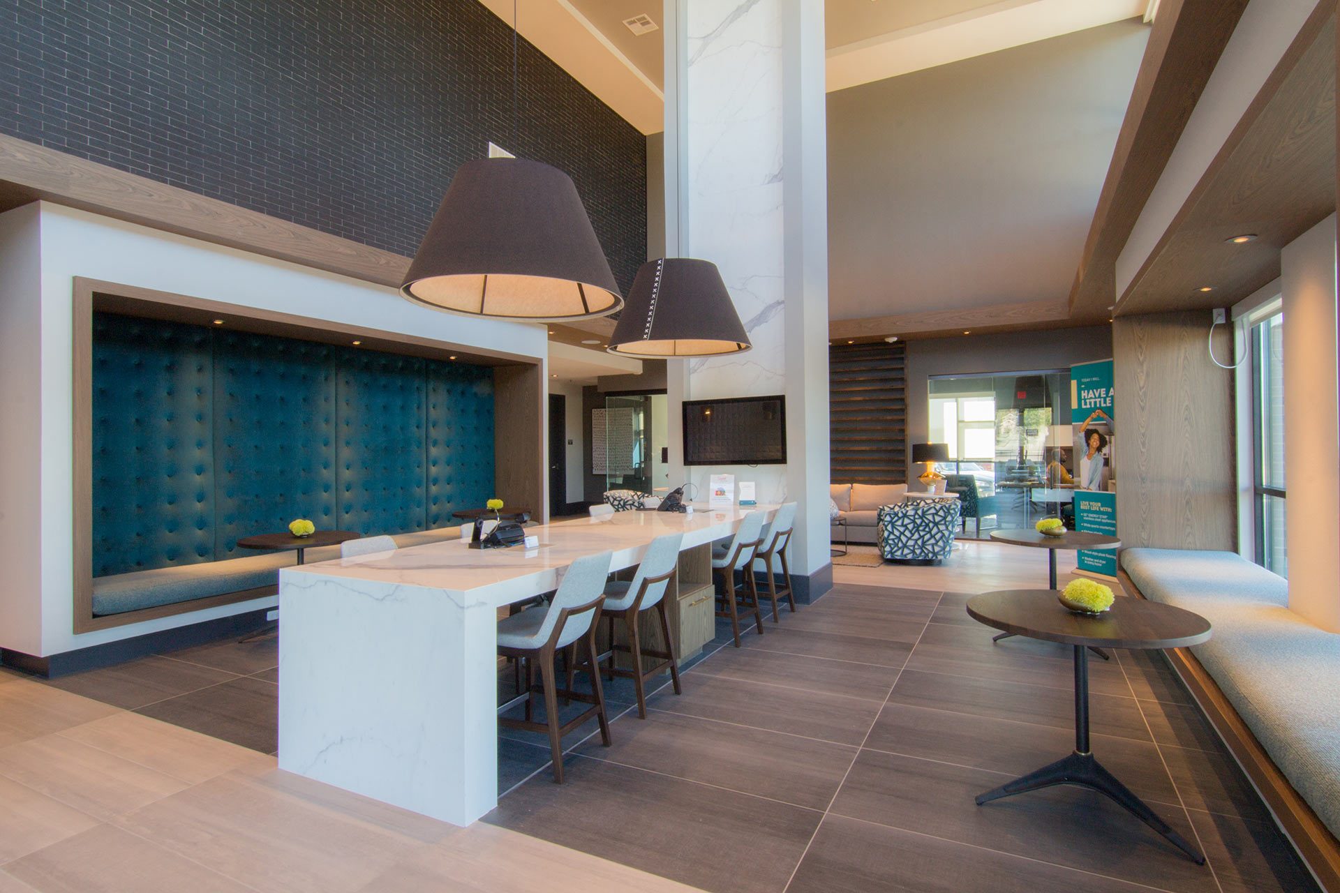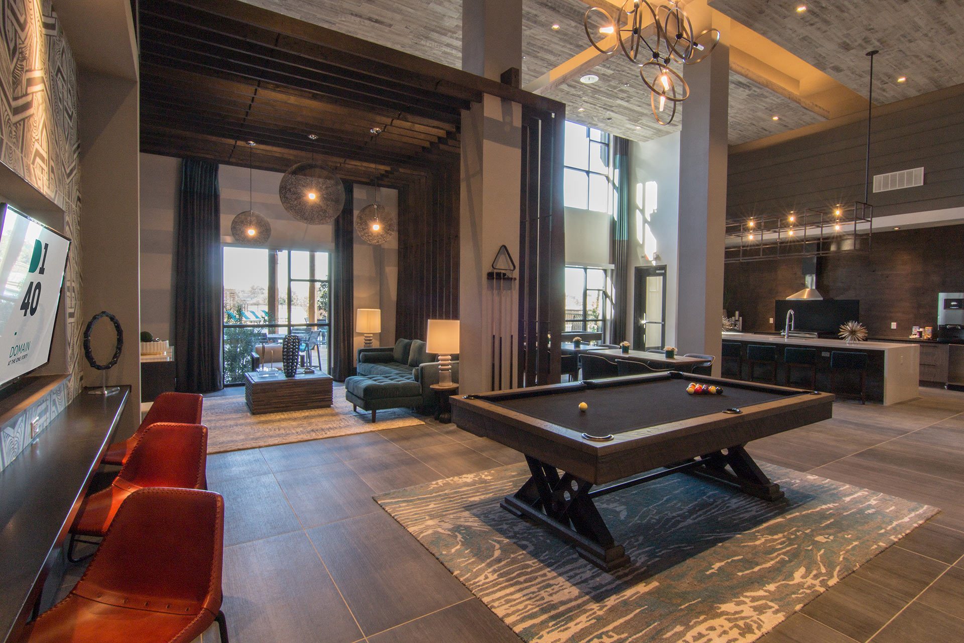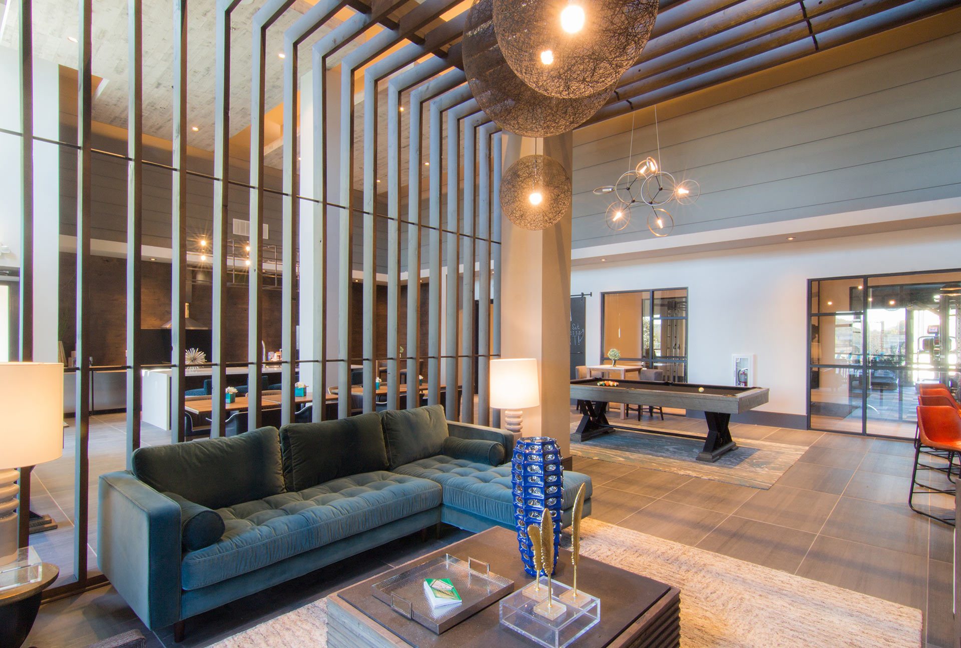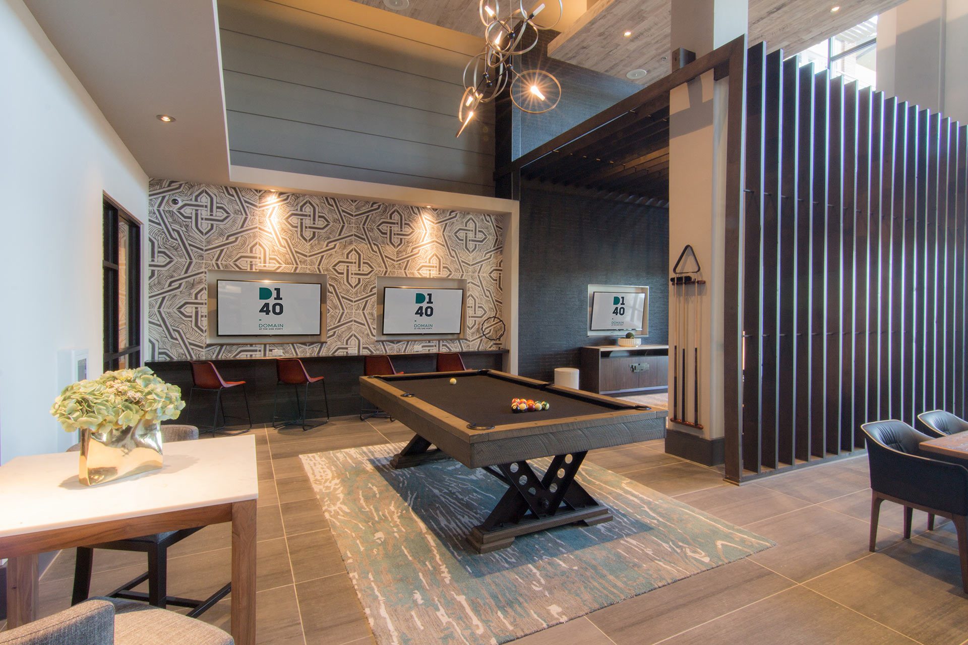 Appealing to the city dweller seeking suburban living, the design team created a modern appeal juxtaposed with the serenity of nature. The interiors feature cantilevered ceilings and wall screens wrapped in wood intended to incorporate the outdoors. The multifunctional seating areas feature built-in banquette seating and a custom marble communal table with a floor to ceiling waterfall.