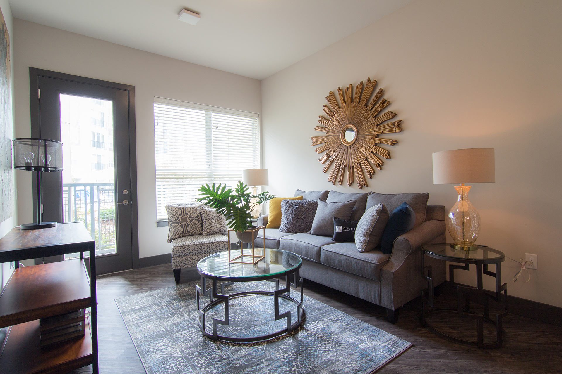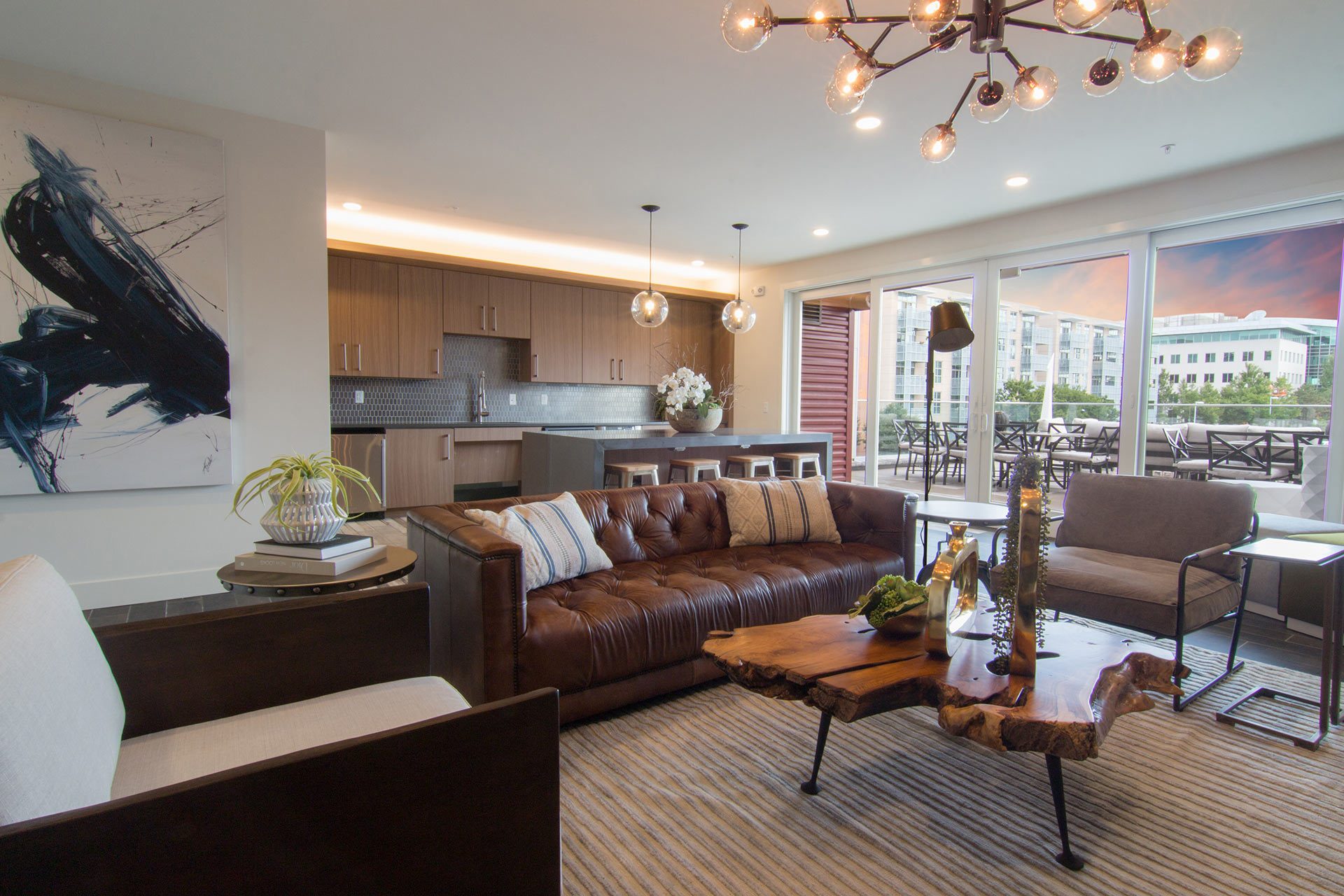 Encore’s centralized community spaces embrace an environment of enhanced engagement and interactivity. Promoting a well-balanced lifestyle with access to all the best things life on site was an integral part of the project. Inside, moody interiors facilitate industrial lighting with dark layers of texture and rich leather sofas combined with wooden accents. Banquette seating creates an intimate setting while the oversized open air sky lounge that overlooks the courtyard comes with a demo kitchen and TV as well as fire pits with comfy lounge areas.