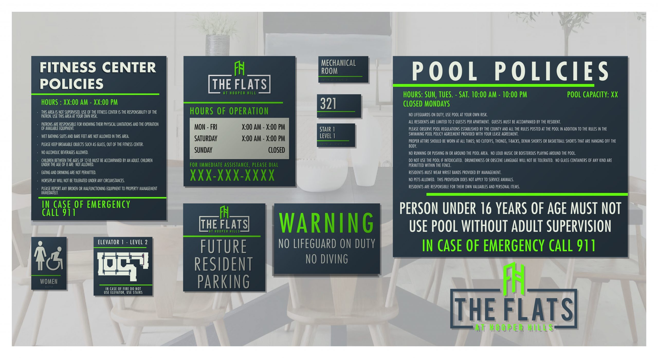 Located in Conroe, Texas, The Flats at Hooper Hill will host 150 units and 6,000 square feet of resident amenities. Bold lines and a vibrant palette are the hallmark of the Interior Design and are reflected in the energetic typeface and angular geometry of both the new brand identity and comprehensive Signage Design package.