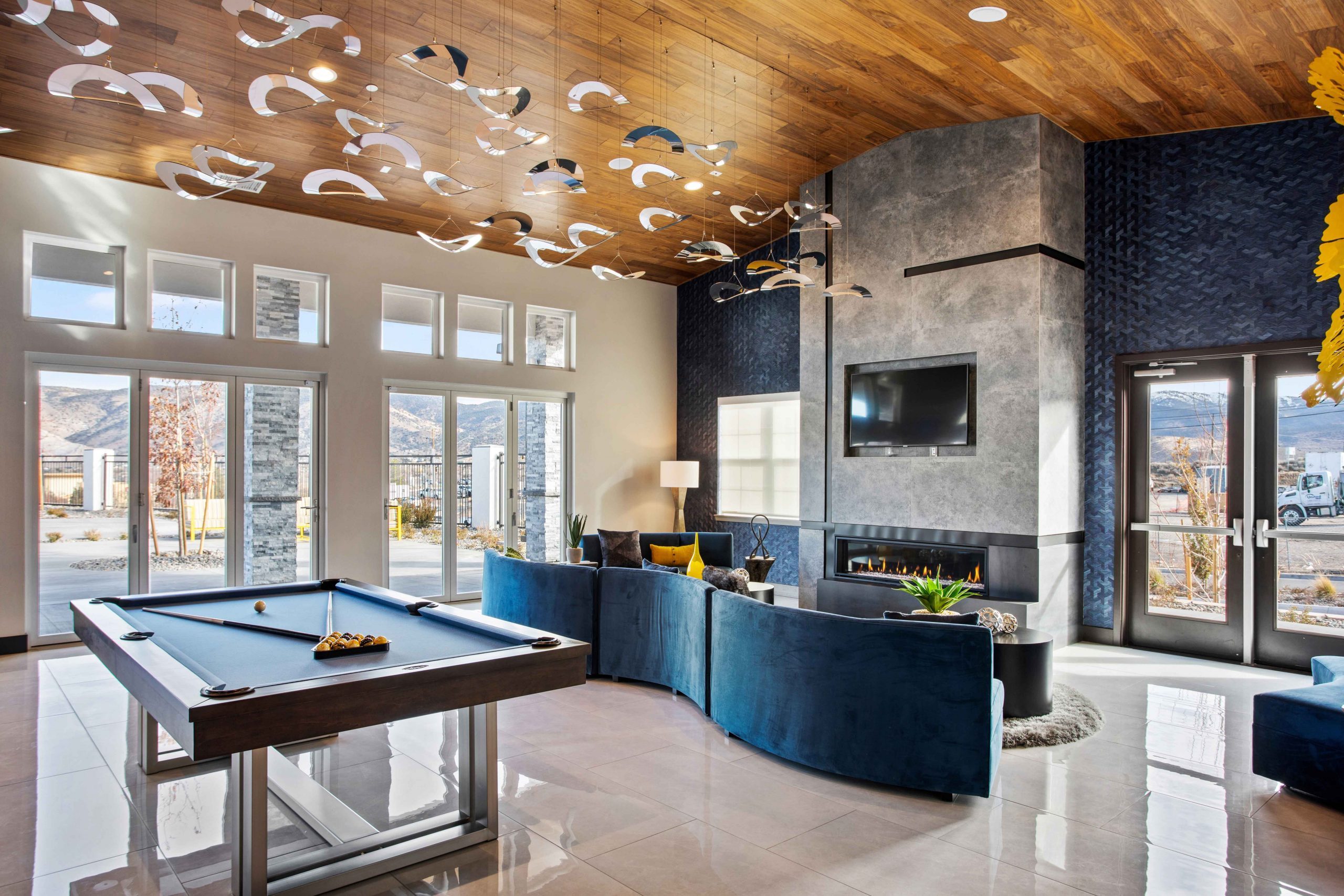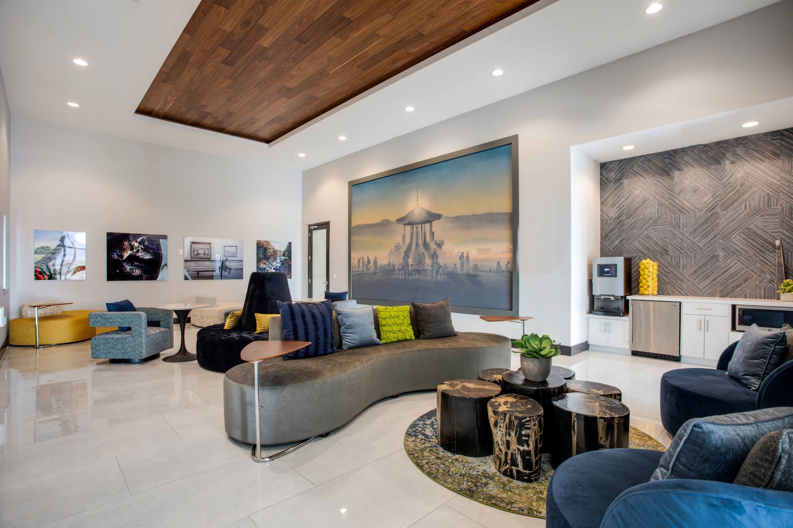 The color palette was strategically selected to highlight Nevada’s breathtaking nature, with each color representing the dynamic local landscape. Rich blues signify the majesty of Lake Tahoe while warm beige tones symbolize the extraordinary Desert Mountains interwoven with dark woods, neutral gray tones, natural stone, subtle hints of green with various plant life and greenery, as well as pops of bright sunny yellow in the art and accessories.