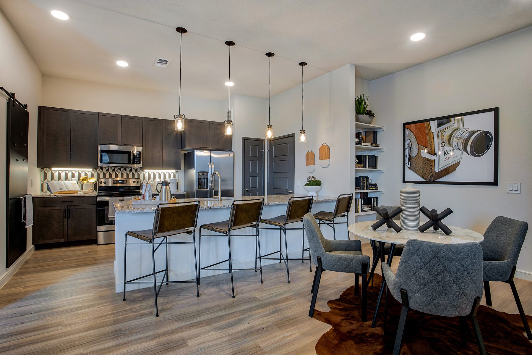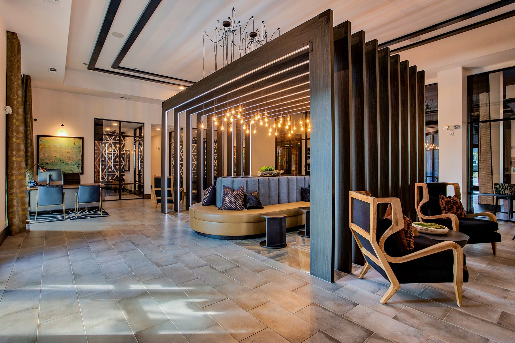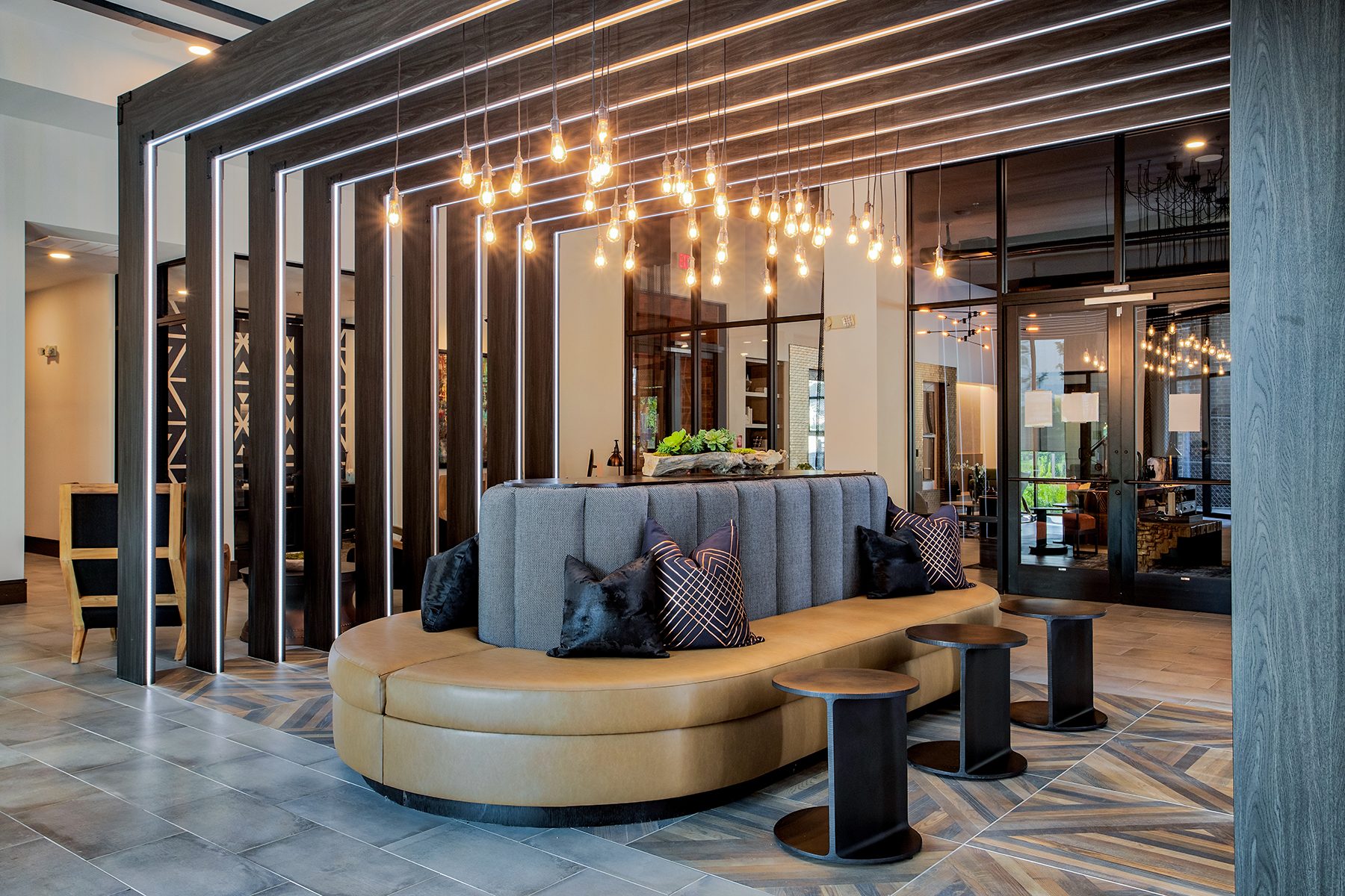 Reflecting an urban, eclectic vibe that is inviting and down to earth, the warm modern industrial interiors strike a chord with strong clean lines that is hip yet comfortable as well as authentic and approachable. Metals with matte finishes and a background of cool undertones are mixed with accents of concrete, wood and metal, some made of salvaged, recyclable materials.