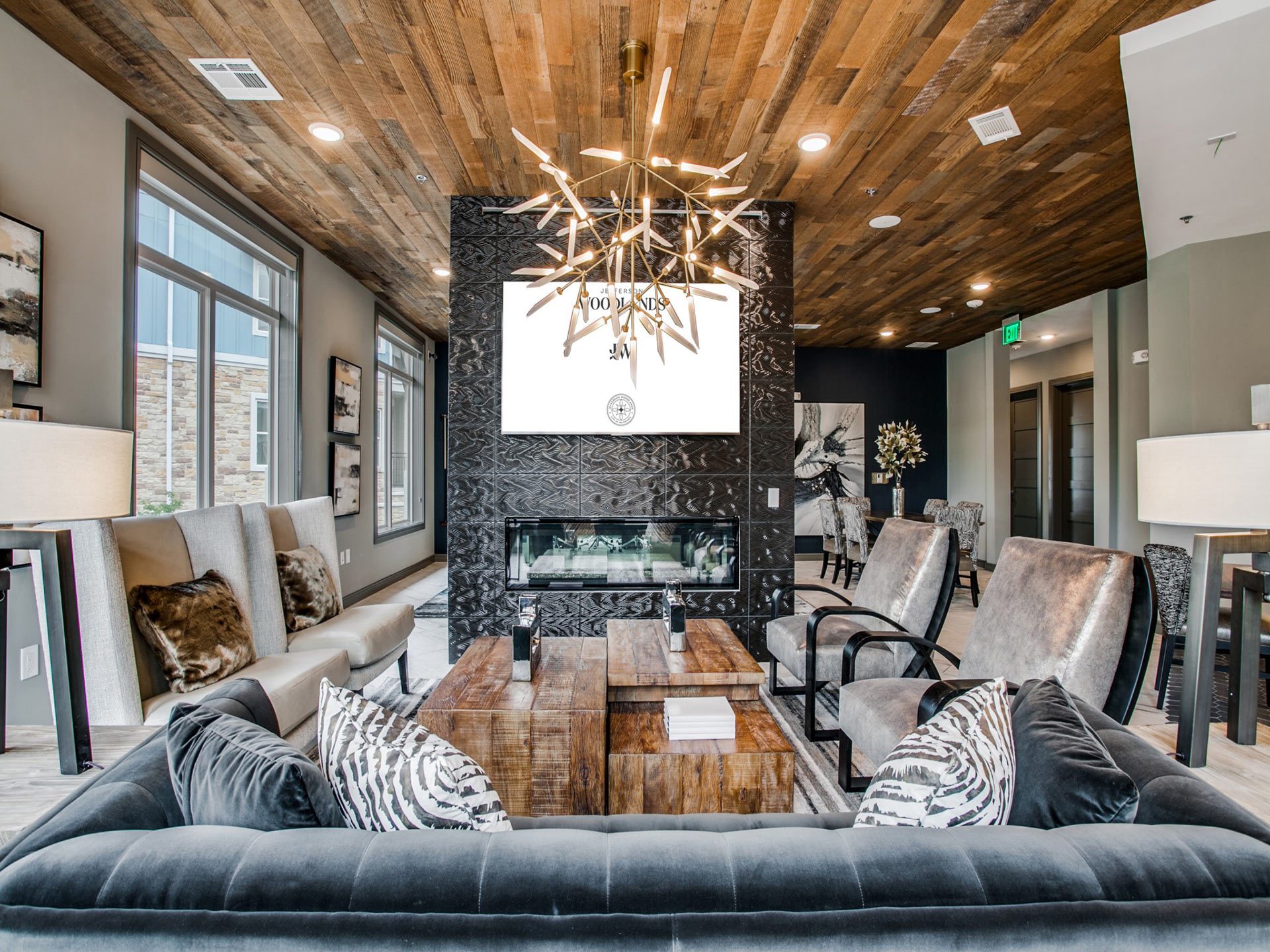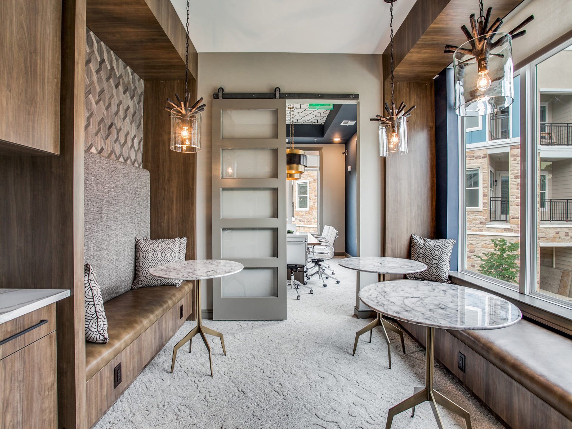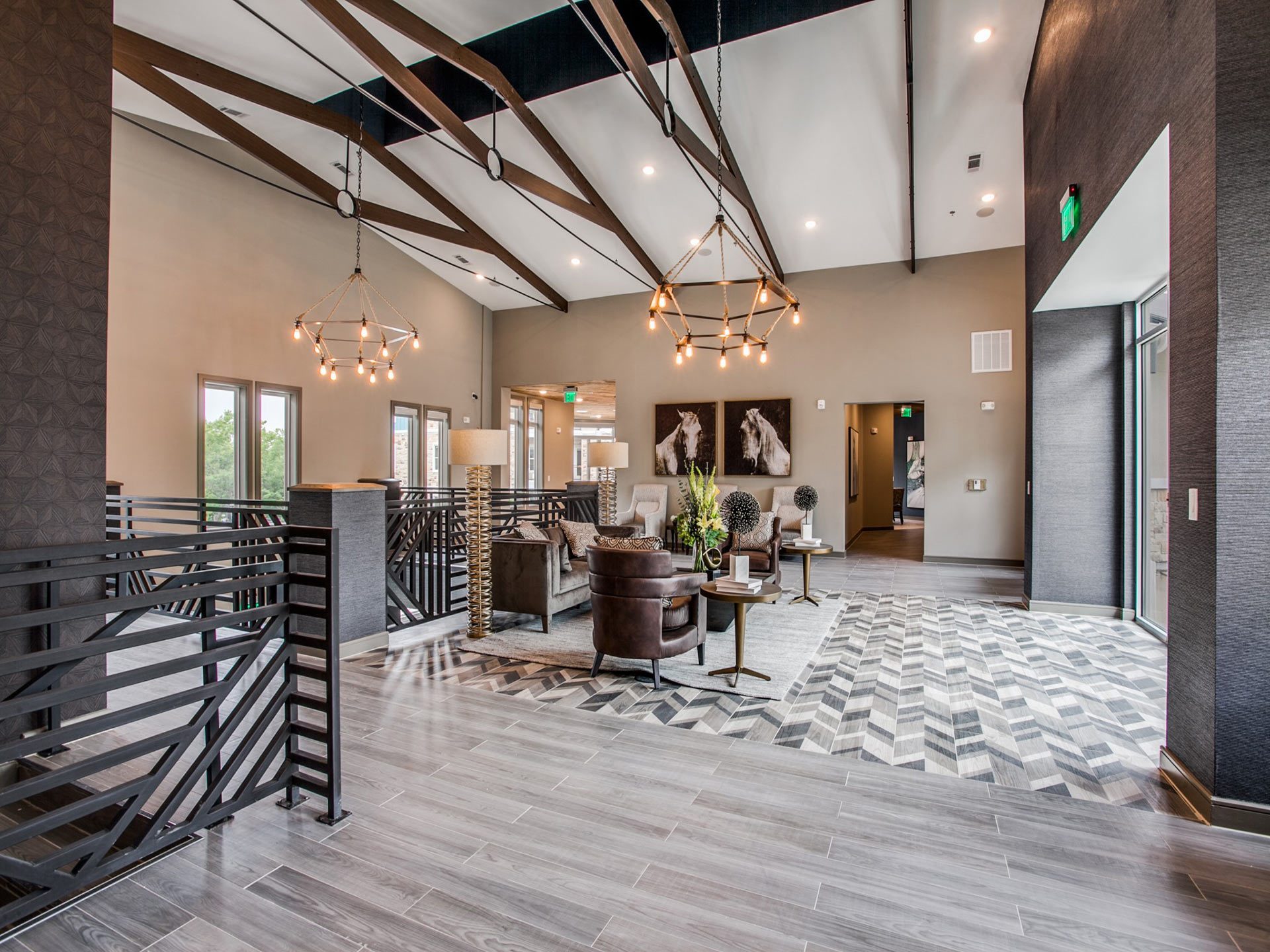 Jefferson Woodlands was strategically developed within a new luxury lakeside community located in Garland, Texas. The Arts & Crafts-inspired interiors paved the way for the overall design with unique finish compositions and interactive amenities. Built partially underground, the ground floor amenity spaces received limited natural light. After a sun study was conducted, the design team were able to balance the light levels from the back of the interior rooms to the front facing windows at all times of day. Maximizing the impressive height of the leasing center, wood trusses span the ceiling on the same axis as the exterior creating a rhythm that naturally guides visitors to the main lobby while creative floor patterns subtly defined areas without signage. The open-concept floor plan capitalizes on the views of the pool and lush landscape and leads prospective residents on a path of discovery.