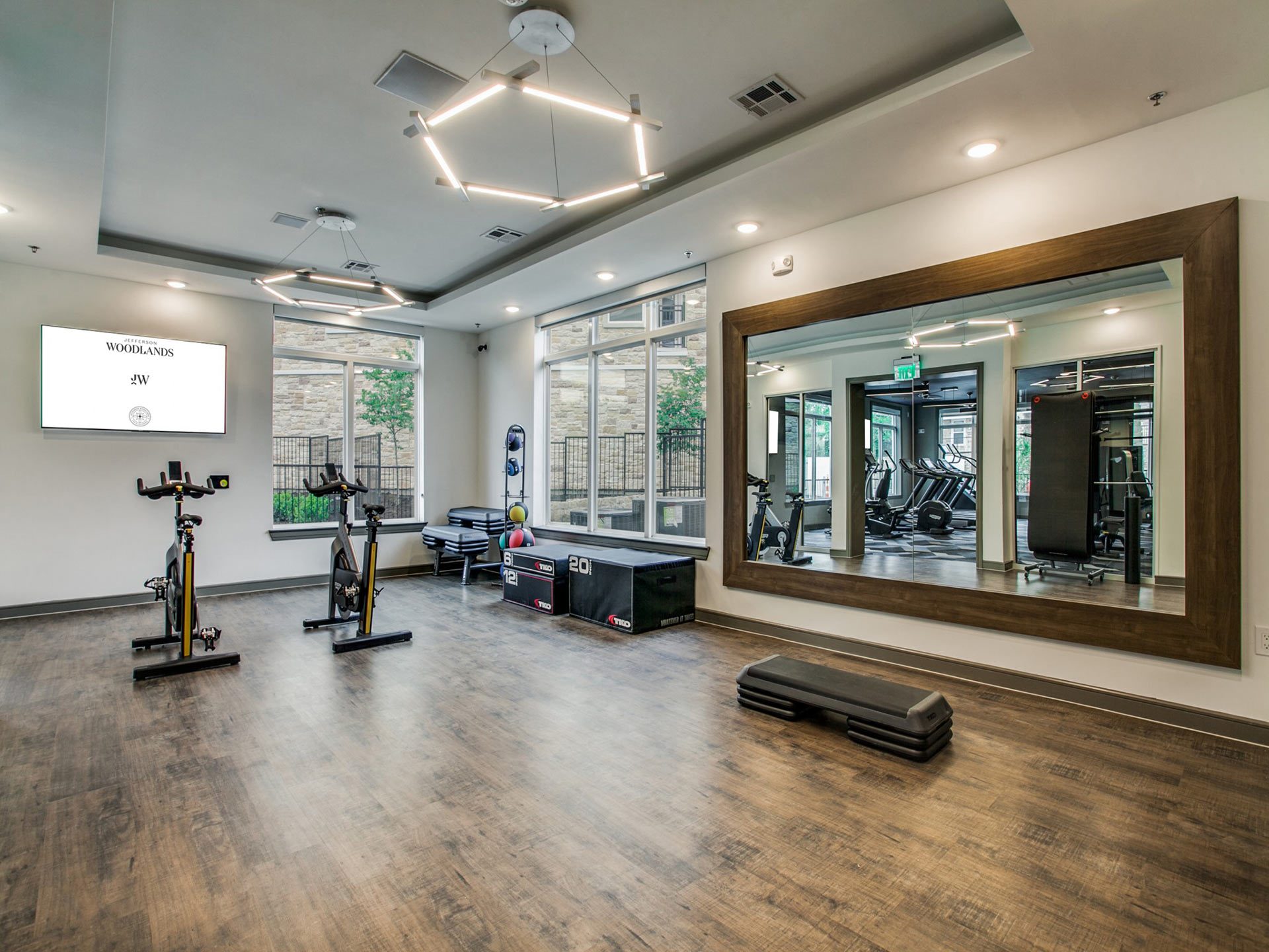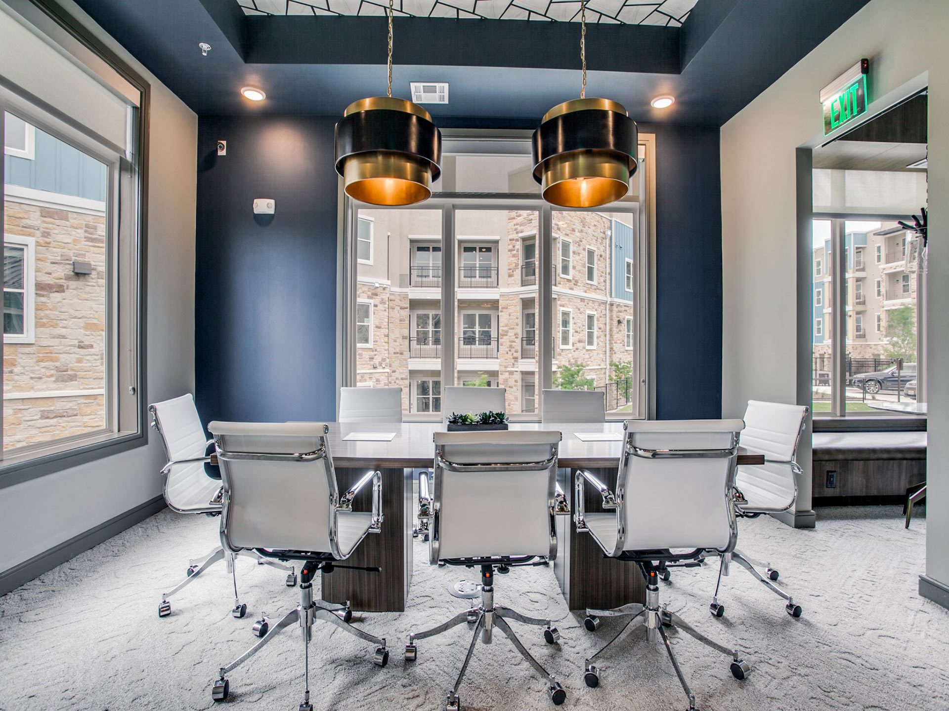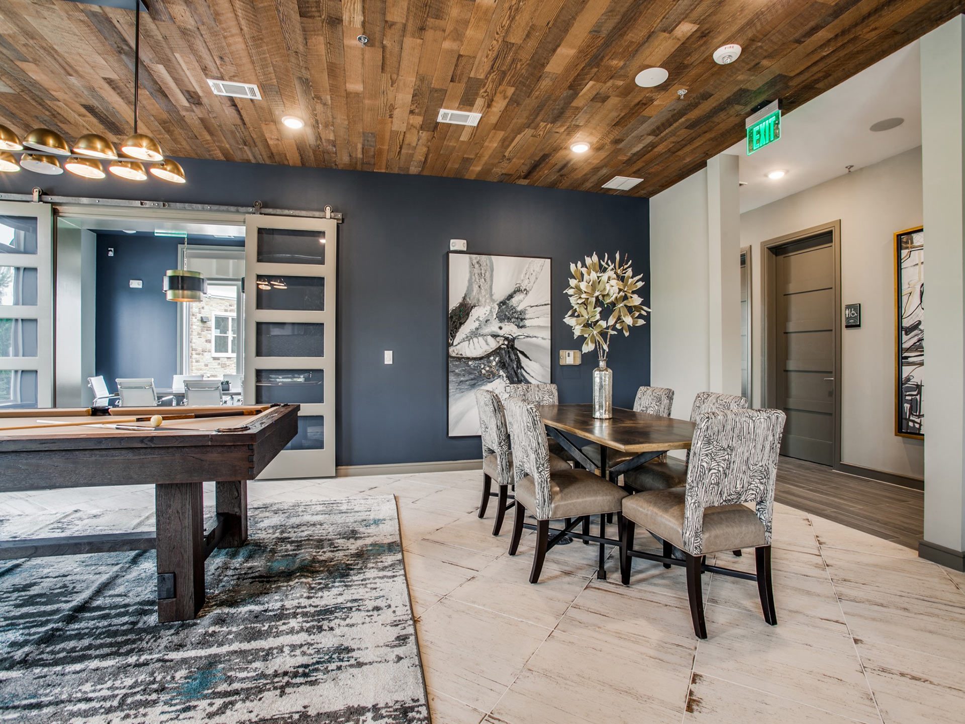 Jefferson Woodlands was strategically developed within a new luxury lakeside community located in Garland, Texas. The Arts & Crafts-inspired interiors paved the way for the overall design with unique finish compositions and interactive amenities. Built partially underground, the ground floor amenity spaces received limited natural light. After a sun study was conducted, the design team were able to balance the light levels from the back of the interior rooms to the front facing windows at all times of day. Maximizing the impressive height of the leasing center, wood trusses span the ceiling on the same axis as the exterior creating a rhythm that naturally guides visitors to the main lobby while creative floor patterns subtly defined areas without signage. The open-concept floor plan capitalizes on the views of the pool and lush landscape and leads prospective residents on a path of discovery.