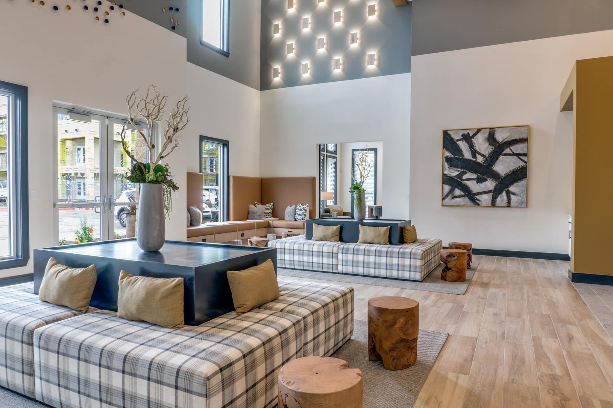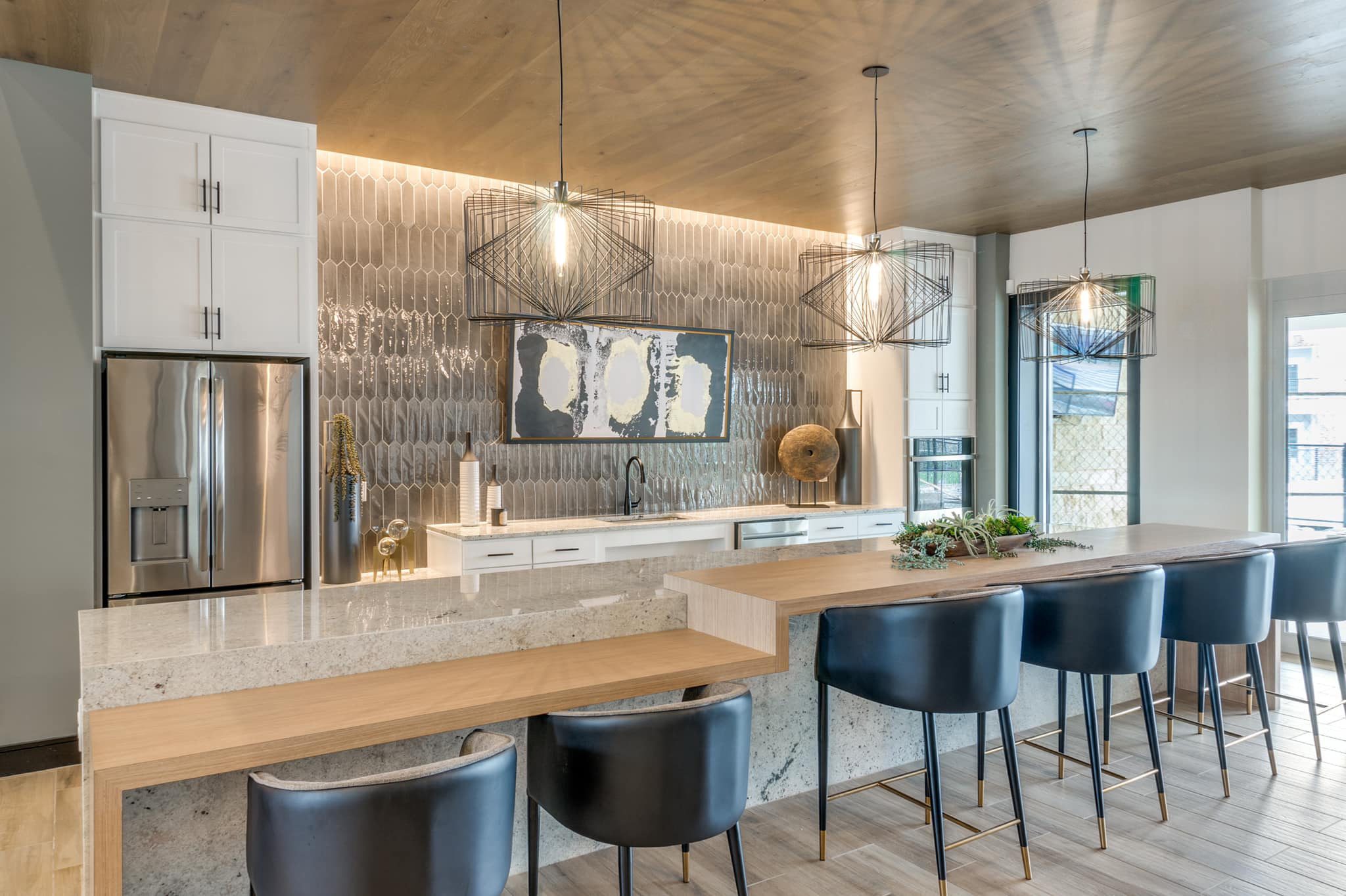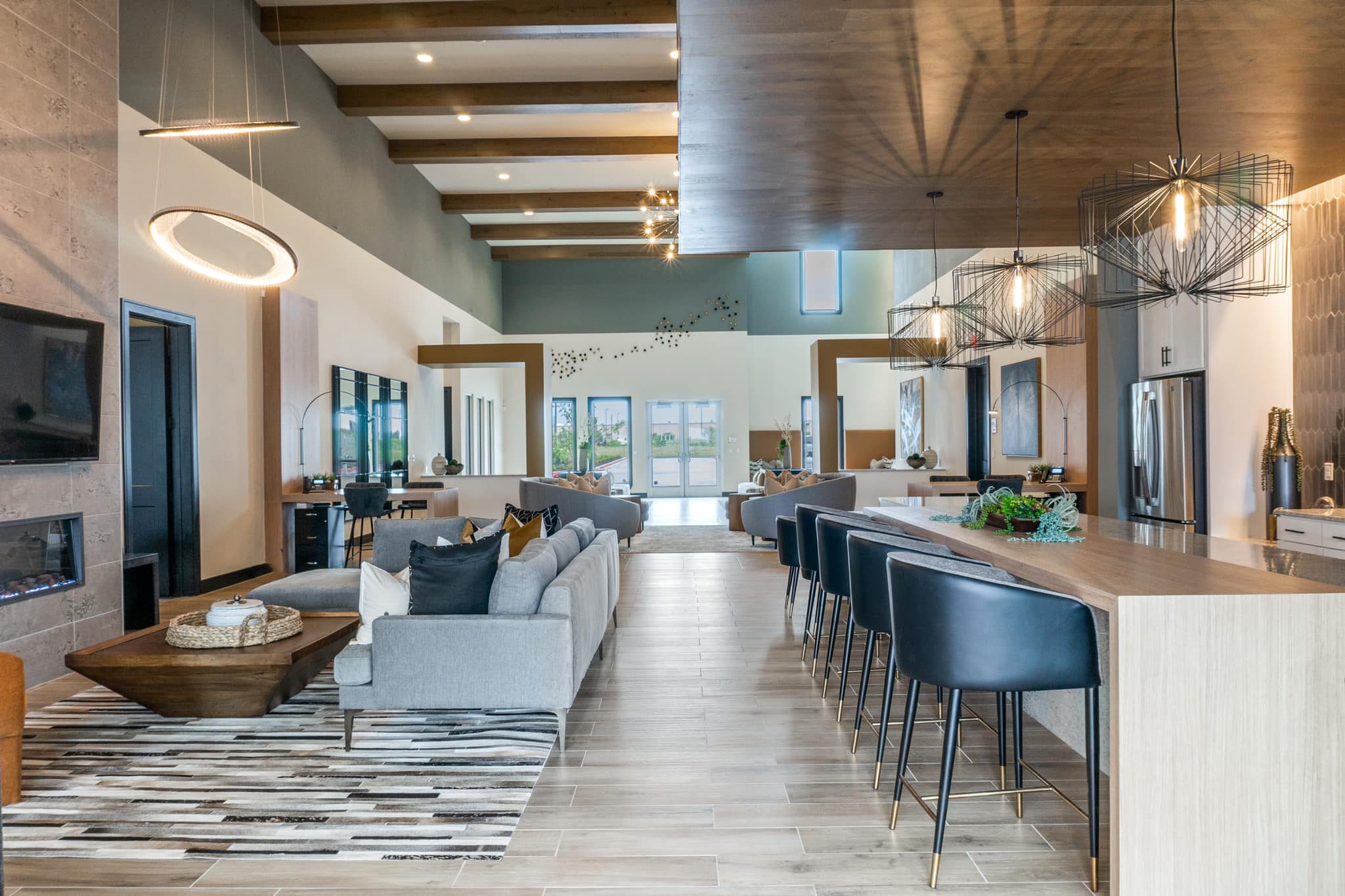 Located just outside of Dallas, in Terrell, this 3-story community is located in an up-and-coming neighborhood near shopping and restaurants. Modern sophistication is portrayed with the use of natural textures and a soft color palette. Double volume ceilings and stunning millwork bring soaring ceilings down to scale while an expansive demonstration kitchen and movable doors invite residents to connect. Amenities include a resort-style pool and lounge, an outdoor grotto with shuffleboard, media room, and pet park.