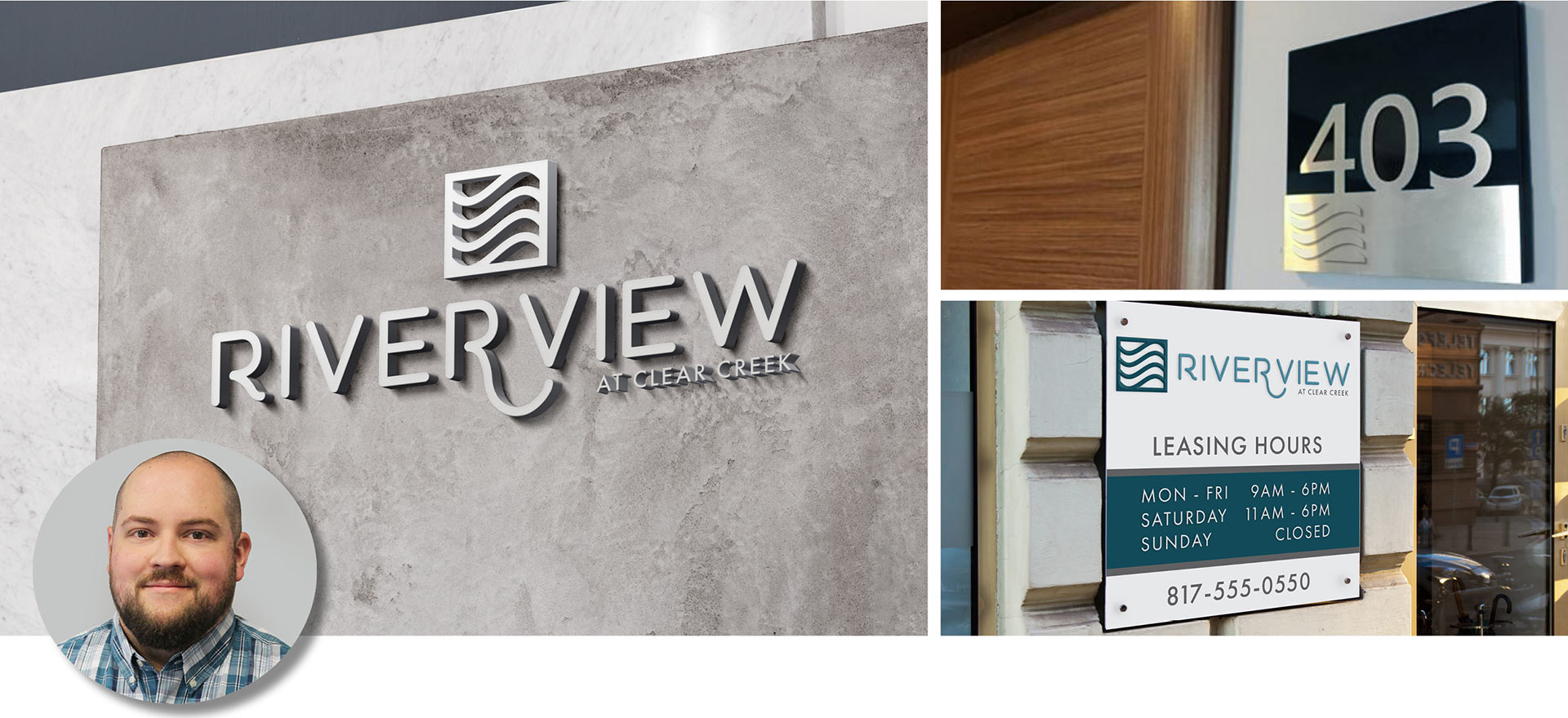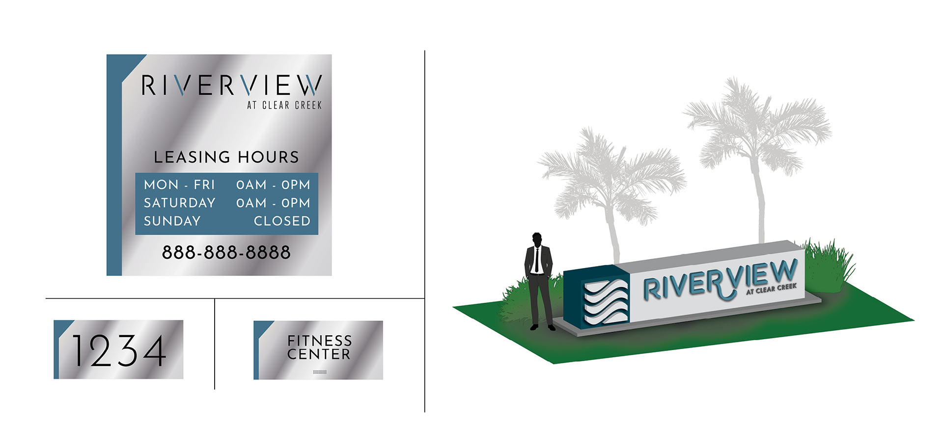A: The signage and interiors process have a lot of overlap. In the beginning, we host a project kick-off meeting where we sit down with the client to get an idea of the overall look and feel they want to achieve by reviewing site plans, elevations, and renderings. Following that, is the logo and identity creation. If it’s new construction, this helps springboard the entire project’s design direction and can unify the vision for the entire project and consultant team. If it’s a renovation, we join our client for a site study and walk the property, after which we go over renter demographics, context, and the neighborhood. Finally, the design phase is initiated with concepts such as logos, ancillary signs, and leasing identity to give them a visual road map for the entire package. From there, we consider multiple options and choose one for final approval. Lastly, we move onto materials, manufacturing, and finally installation all while keeping them in the loop every step of the way.